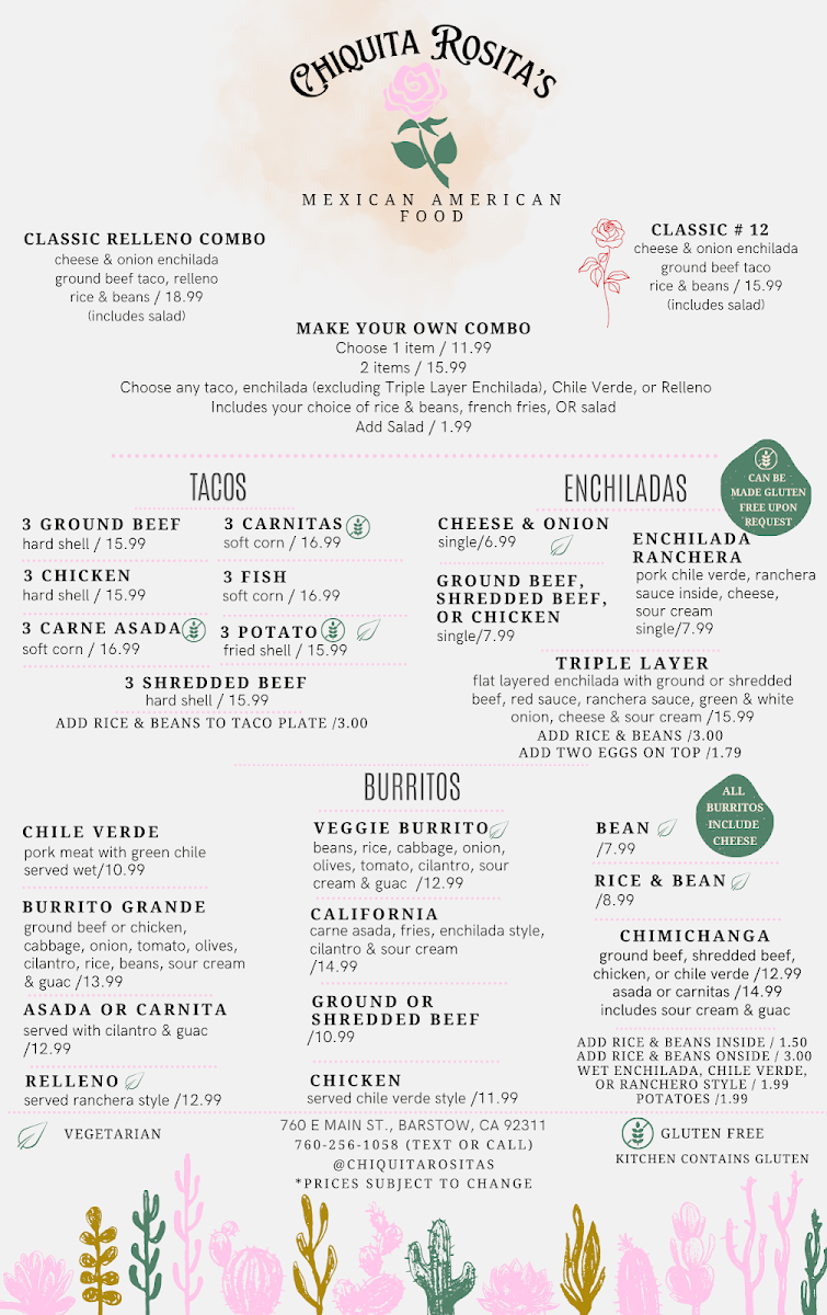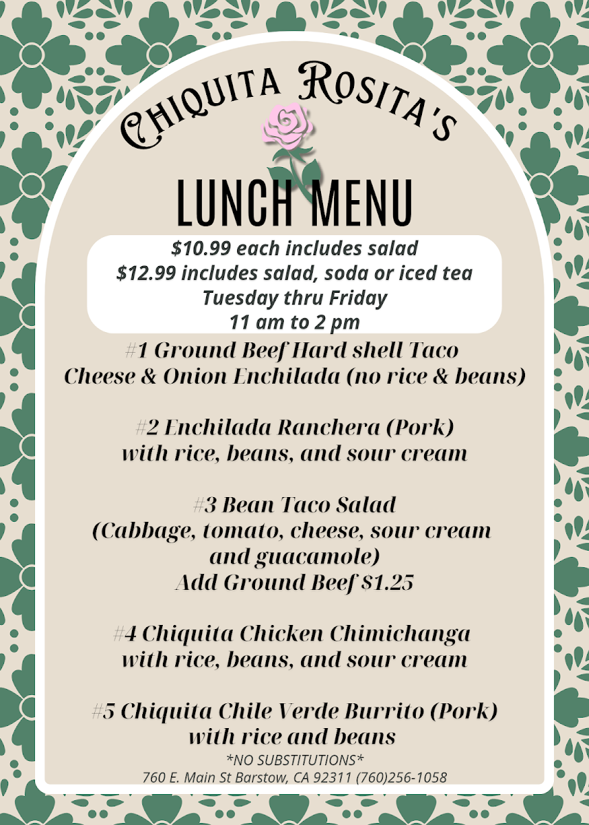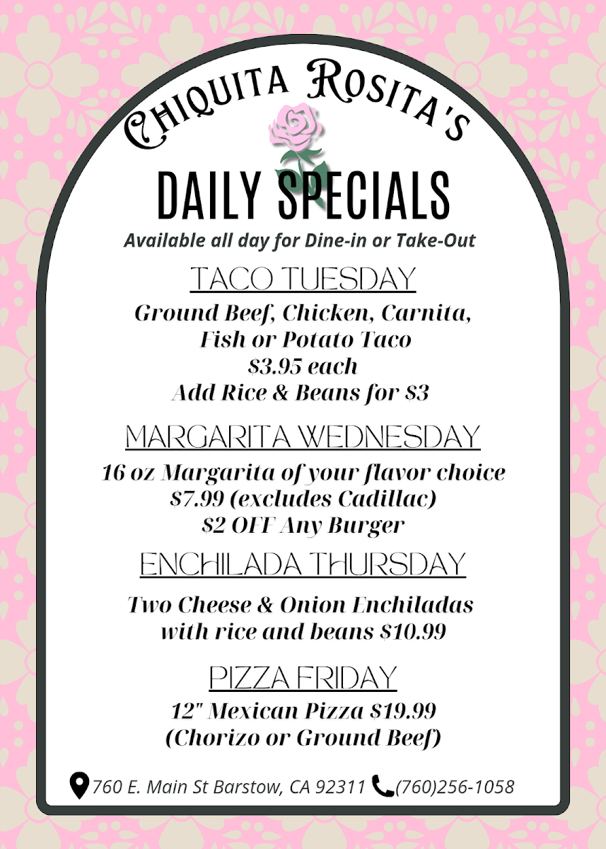 When you're looking for a place to enjoy some authentic and flavorful dishes, look no further than Chiquita Rosita's Menu. Nestled in the heart of Barstow, CA, at 760 E Main St, this charming spot offers a delightful variety of options that will satisfy any craving. Whether you're in the mood for zesty tacos, savory enchiladas, or a refreshing margarita to pair with your meal, there's something for everyone. Each dish is crafted with fresh ingredients and bold flavors, making it a perfect spot to unwind with friends or family. From hearty meals to lighter bites, the menu provides a great mix of Mexican staples and house specialties, all served with a warm, welcoming vibe. The next time you're in the area, don't miss the chance to experience this local gem for yourself.