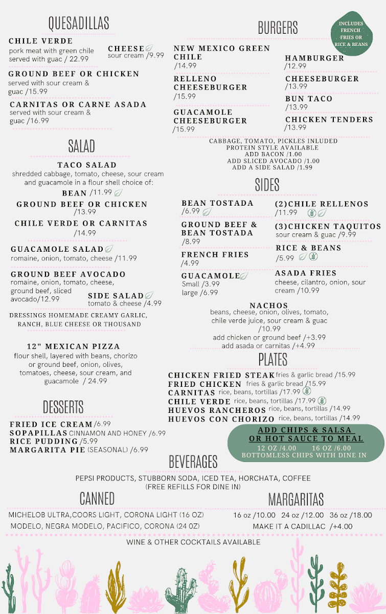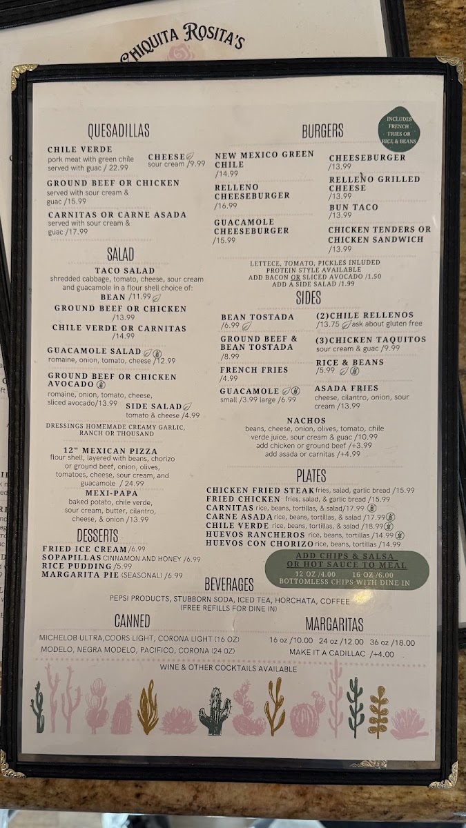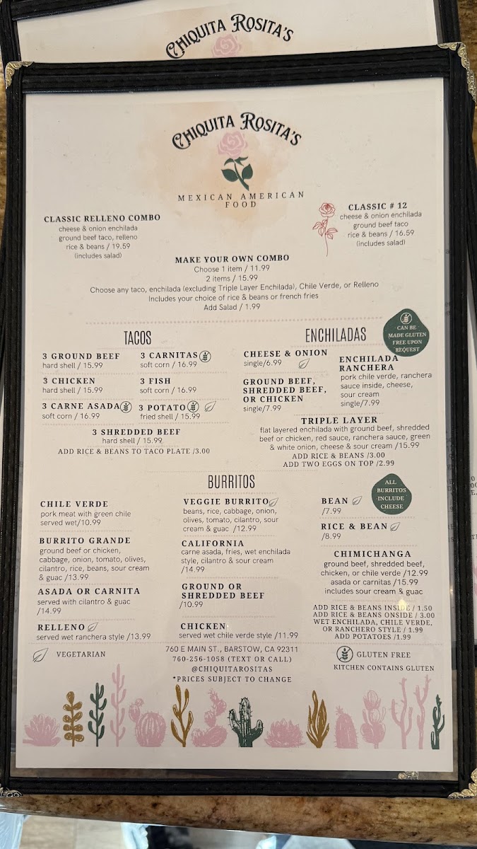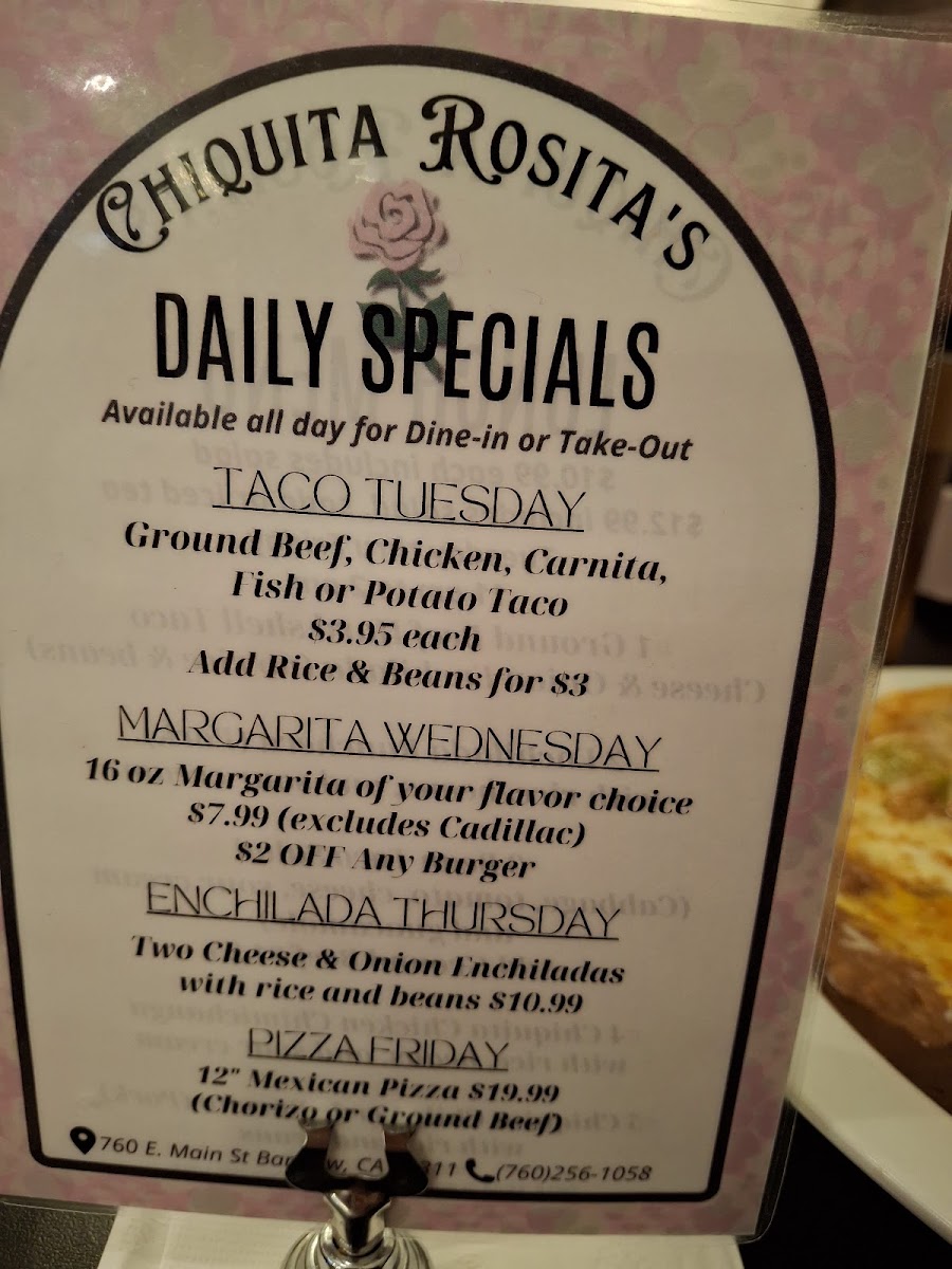 When you're looking for a place to enjoy some authentic and flavorful dishes, look no further than Chiquita Rosita's Menu. Nestled in the heart of Barstow, CA, at 760 E Main St, this charming spot offers a delightful variety of options that will satisfy any craving. Whether you're in the mood for zesty tacos, savory enchiladas, or a refreshing margarita to pair with your meal, there's something for everyone. Each dish is crafted with fresh ingredients and bold flavors, making it a perfect spot to unwind with friends or family. From hearty meals to lighter bites, the menu provides a great mix of Mexican staples and house specialties, all served with a warm, welcoming vibe. The next time you're in the area, don't miss the chance to experience this local gem for yourself.